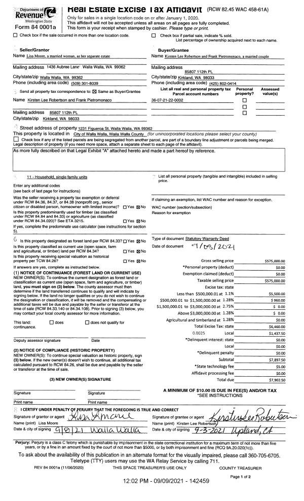 | 2 | 10/07/2021 | SWD | STATUTORY WARRANTY DEED | | ROBERTSON KIRSTEN LEE | | 2-PARCELS | | 142625 | 2021-12210 |