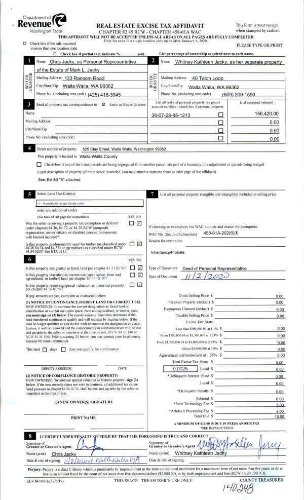 | 3 | 11/03/2020 | DPR | DEED OF PERSONAL REPRESENTATIVE | JACKY MARK ESTATE OF | JACKY WHITNEY K | | | | 140248 | 2020-11481 |