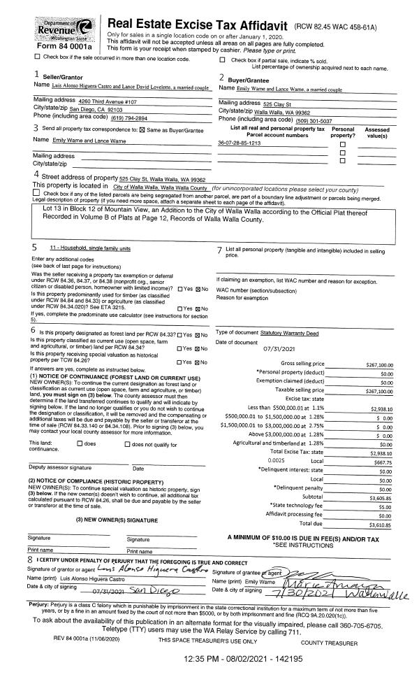 | 1 | 07/02/2021 | SWD | STATUTORY WARRANTY DEED | CASTRO LUIS ALONSO HIGUERA | WARNE EMILY & LANCE | | | $267,100.00 | 142195 | 2021-09407 |