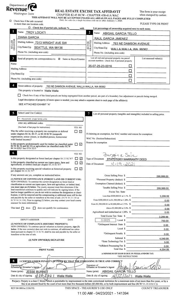 | 1 | 04/23/2021 | BARGAIN & | BARGAIN & SALE DEED | LOCATI TROY | TELLO ABIGAIL GARCIA & RAUL GARCIA JIMENEZ | | | $299,999.00 | 141394 | 2021-04775 |