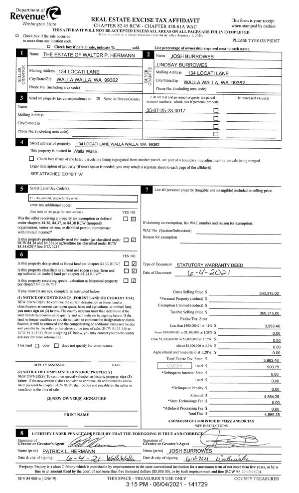 | 1 | 06/04/2021 | SWD | STATUTORY WARRANTY DEED | HERMANN WALTER P ESTATE OF | BURROWES JOSH & LINDSAY | | | $360,315.00 | 141729 | 2021-06836 |
