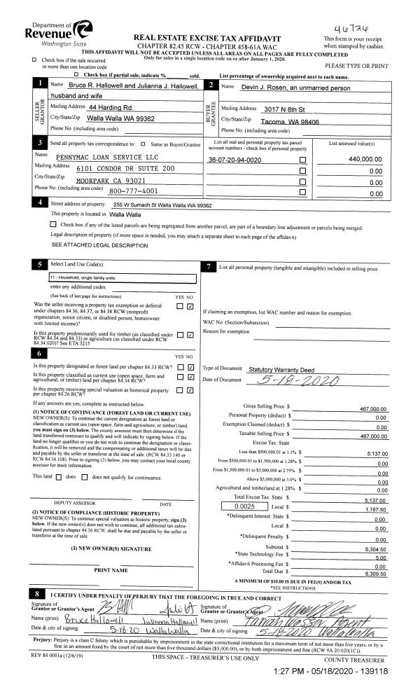 | 3 | 05/18/2020 | SWD | STATUTORY WARRANTY DEED | HALLOWELL BRUCE R & JULIANNA J | ROSEN DEVIN J | | | $467,000.00 | 139118 | 2020-04339 |