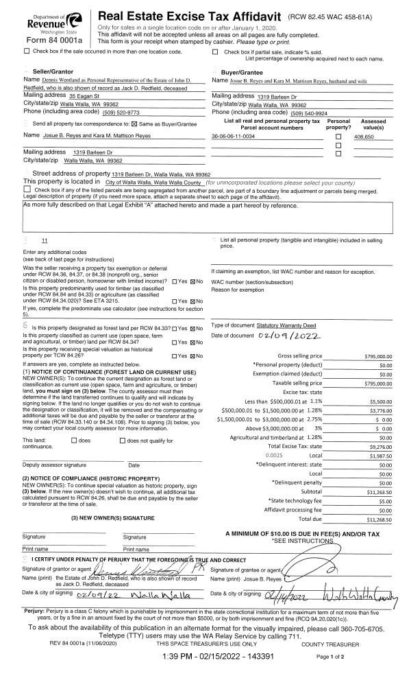 | 1 | 02/15/2022 | SWD | STATUTORY WARRANTY DEED | REDFIELD JACK D ESTATE OF | REYES JOSUE B & KARA M MATTISON | | | $795,000.00 | 143391 | 2022-01378 |