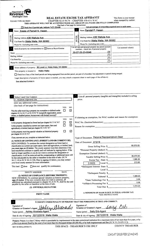 | 2 | 02/12/2018 | DPR | DEED OF PERSONAL REPRESENTATIVE | HAGEN PARNELL N ESTATE OF | HAGEN RANDALL P | | | $85,570.00 | 134147 | 2018-01241 |