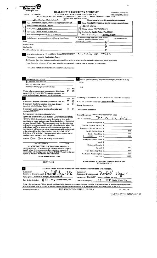| 1 | 01/26/2018 | DPR | DEED OF PERSONAL REPRESENTATIVE | HAGEN PARNELL N ESTATE OF | HAGEN RANDALL P | | | | 134054 | 2018-00755 |
