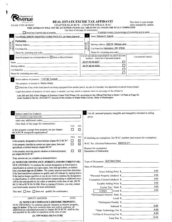 | 3 | 02/01/2015 | QCD | QUIT CLAIM DEED | ROSE ARBOR ASSISTED LIVING FACILITY | CARROLL PATRICIA H | | | $0.00 | 127310 | 2015-00507 |