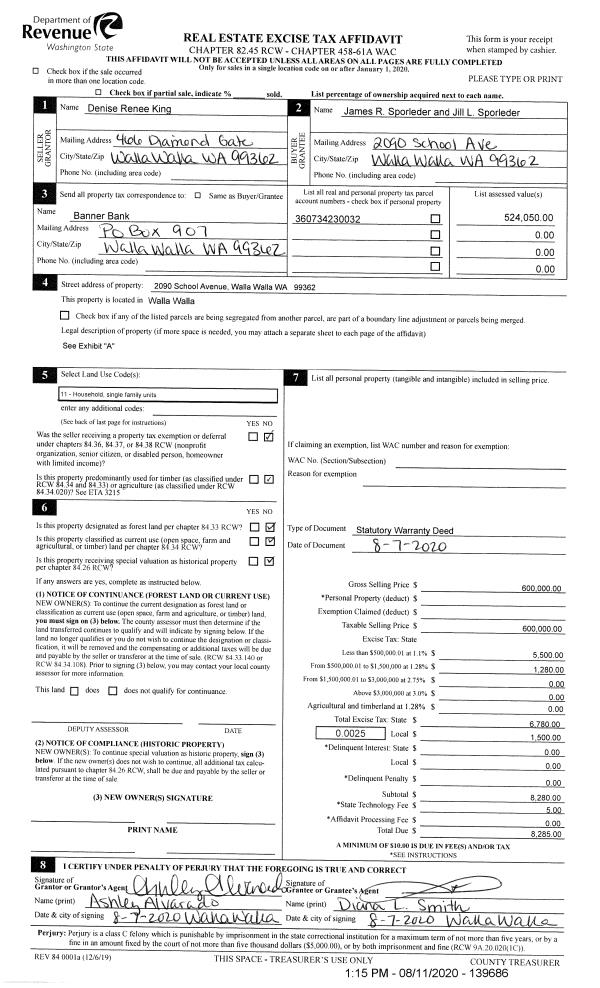 | 1 | 08/11/2020 | SWD | STATUTORY WARRANTY DEED | KING DENISE RENEE | SPORLEDER JAMES R & JILL L | | | $600,000.00 | 139686 | 2020-07916 |