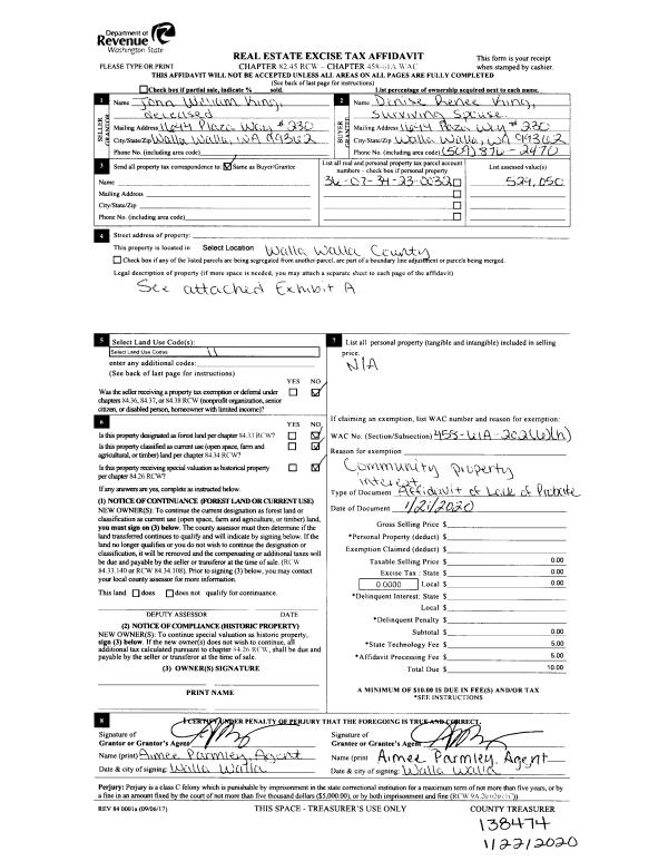 | 2 | 01/21/2020 | LOPA | LACK OF PROBATE AFFIDAVIT | KING JOHN WILLIAM & DENISE RENEE | KING DENISE RENEE | | | $0.00 | 138474 | 2020-00611 |