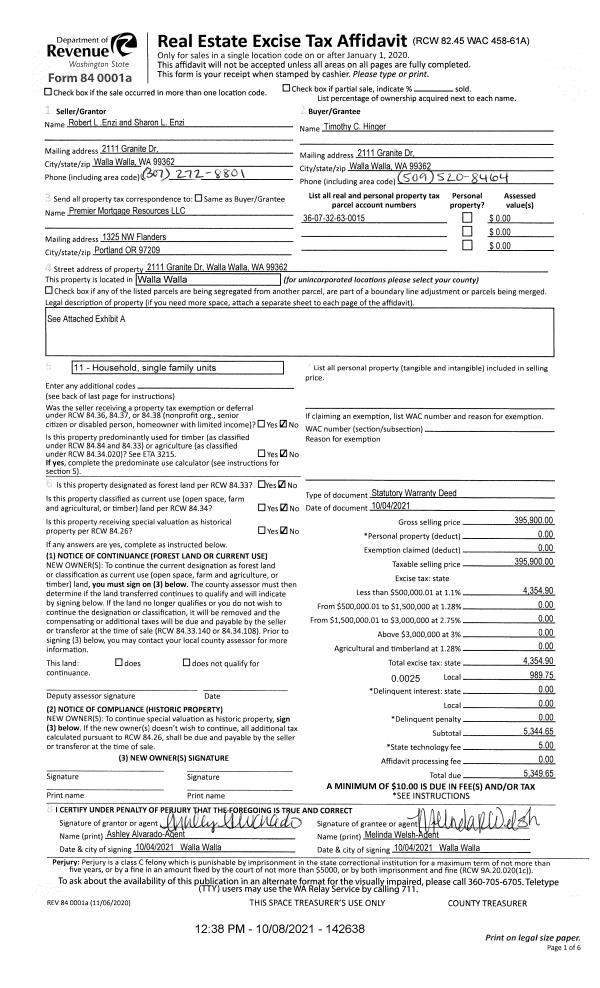 | 2 | 10/08/2021 | SWD | STATUTORY WARRANTY DEED | ENZI ROBERT L & SHARON L | HINGER TIMOTHY C | | | $395,900.00 | 142638 | 2021-12294 |