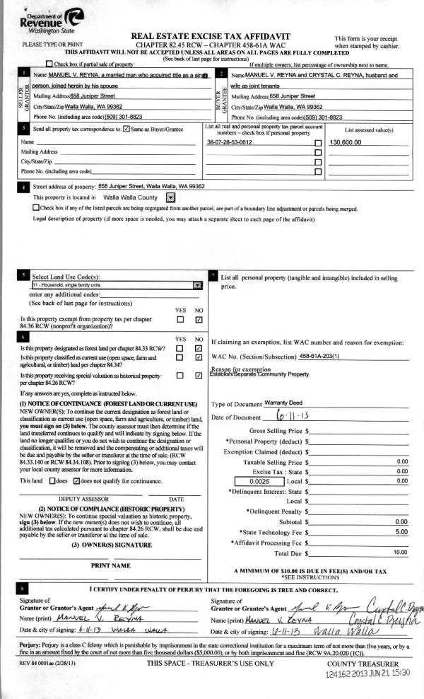 | 5 | 06/21/2013 | WARRANTY D | WARRANTY DEED | REYNA, MANUEL V | REYNA, MANUEL V & CRYSTAL C | | | $0.00 | 124162 | 2013-06249 |