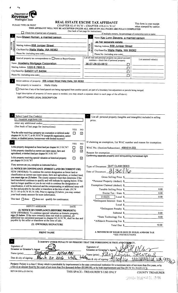 | 3 | 03/31/2016 | QCD | QUIT CLAIM DEED | NYMAN SHAWN | STEVENS KAY LYNN | | | | 129934 | 2016-02371 |