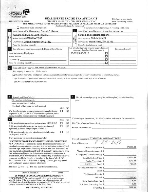 | 4 | 03/31/2016 | SWD | STATUTORY WARRANTY DEED | REYNA MANUEL V & CRYSTAL C | STEVENS KAY LYNN | | | $175,000.00 | 129933 | 2016-02370 |