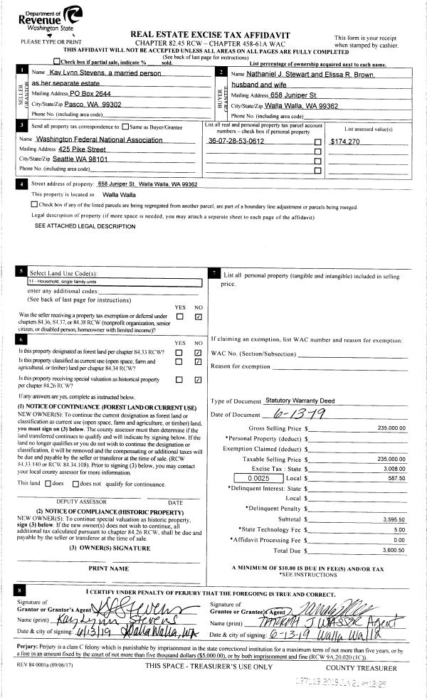 | 2 | 06/21/2019 | SWD | STATUTORY WARRANTY DEED | STEVENS KAY LYNN | STEWART NATHANIEL J & ELISSA R BROWN | | | $235,000.00 | 137119 | 2019-04359 |