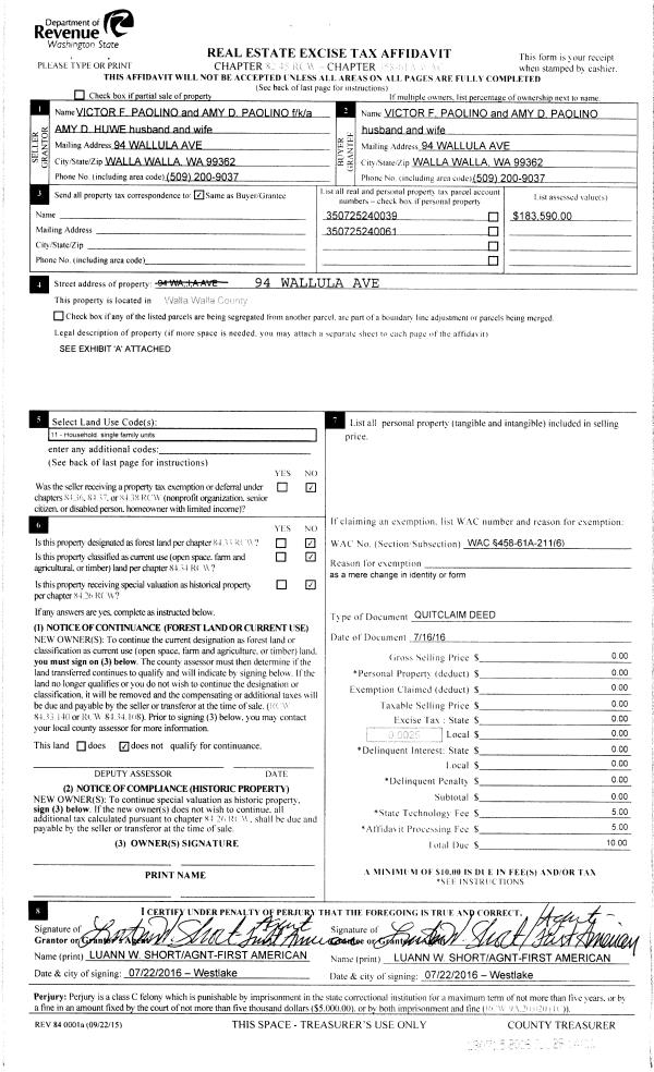 | 2 | 07/16/2016 | QCD | QUIT CLAIM DEED | PAOLINO VICTOR F | PAOLINO VICTOR F & AMY D | | | $0.00 | 130715 | 2016-06534 |