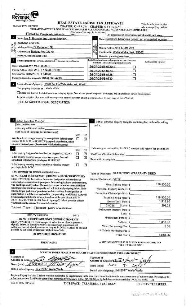 | 1 | 05/05/2017 | SWD | STATUTORY WARRANTY DEED | BRUNDIN IAN S & JAYNE | LOPEZ SOLMAYRA MENDOZA | | 4-PARCELS | $118,500.00 | 132337 | 2017-03416 |