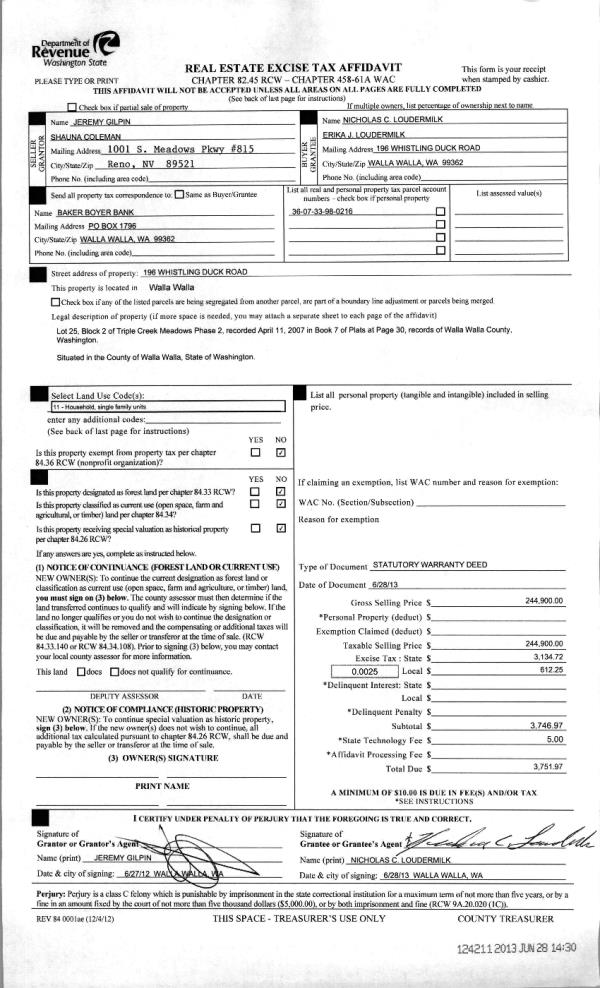 | 1 | 06/28/2013 | WARRANTY D | WARRANTY DEED | GILPIN, JEREMY | LOUDERMILK, NICHOLAS C & ERIKA | | | $244,900.00 | 124211 | 2013-06527 |