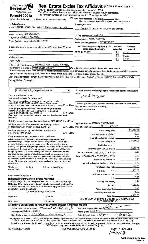 | 1 | 12/23/2020 | SWD | STATUTORY WARRANTY DEED | DRAKE RICHARD L II & RACHEL C | TALL DEREK A & AMBER | | | $315,000.00 | 140613 | 2020-13740 |