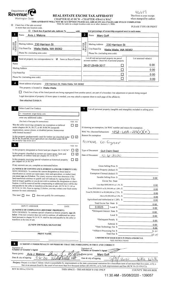 | 5 | 05/06/2020 | QCD | QUIT CLAIM DEED | MALONE AVIS JO | GOFF MARC | | | $0.00 | 139057 | 2020-03945 |