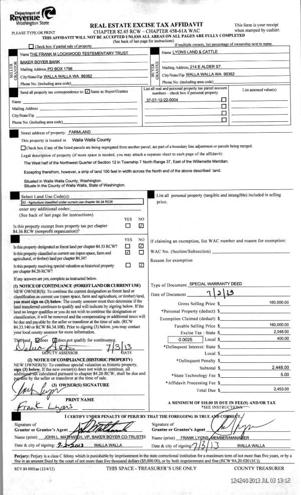 | 2 | 07/03/2013 | WARRANTY D | WARRANTY DEED | LOCKWOOD, FRANK | LYONS LAND & CATTLE LLC | | | $160,000.00 | 124240 | 2013-06703 |