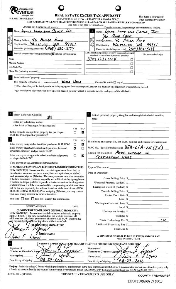 | 1 | 08/29/2016 | QCD | QUIT CLAIM DEED | LYONS LAND & CATTLE LLC | LYONS LAND AND CATTLE INC | | | $0.00 | 130901 | 2016-06879 |