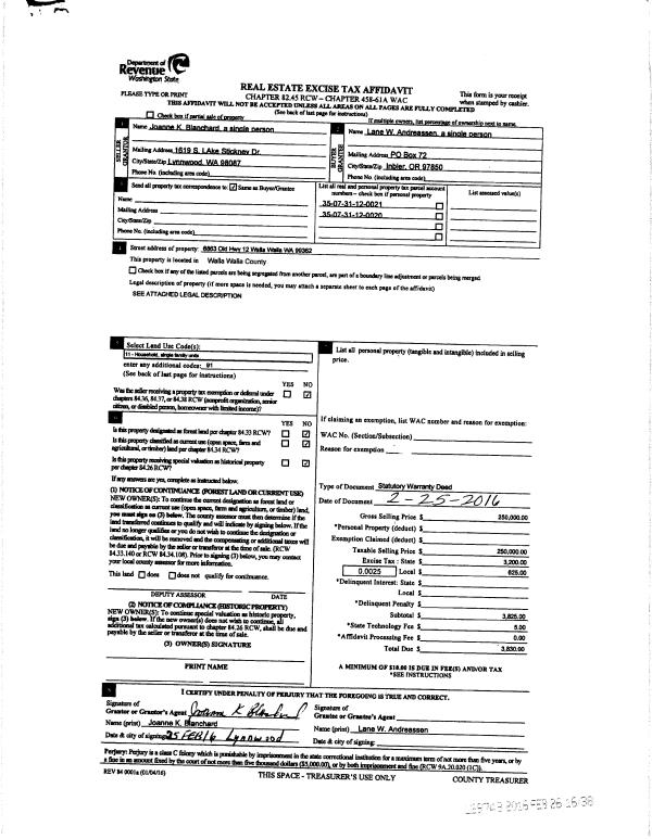 | 1 | 02/26/2016 | SWD | STATUTORY WARRANTY DEED | BLANCHARD JOANNE K | ANDREASSEN LANE W | | 2-PARCELS | $250,000.00 | 129748 | 2016-01462 |