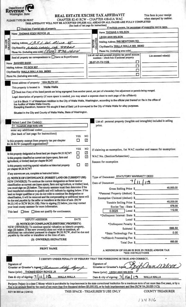 | 3 | 07/22/2013 | WARRANTY D | WARRANTY DEED | WILSON, LEIGH ANN | WILSON, THOMAS A & LEIGH ANN | | | $45,000.00 | 124316 | 2013-07365 |