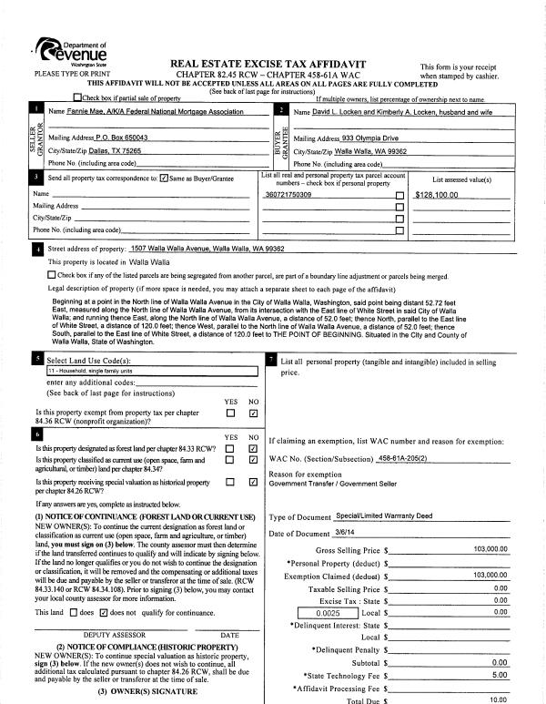 | 2 | 03/07/2014 | SWD | STATUTORY WARRANTY DEED | FEDERAL NATIONAL MORTGAGE ASSOCIATION | LOCKEN DAVID L & KIMBERLY A | | | $103,000.00 | 125534 | 2014-01600 |