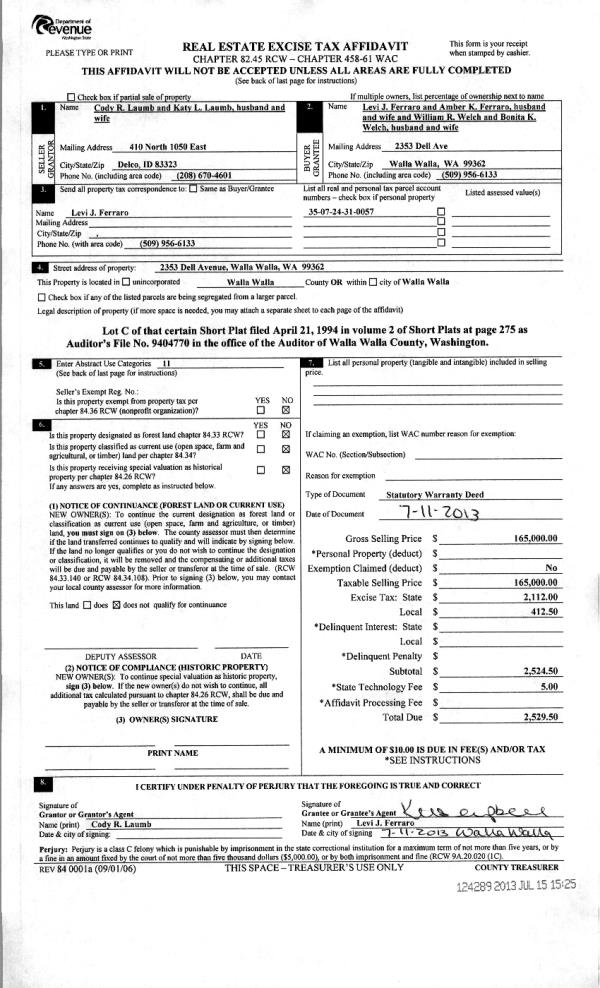 | 3 | 07/15/2013 | WARRANTY D | WARRANTY DEED | LAUMB, CODY R & KATY L | FERRARO, LEVI J & AMBER K | | | $165,000.00 | 124289 | 2013-07123 |