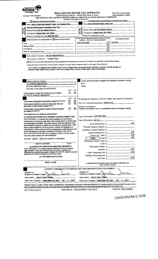 | Mailing Address: | JOHN D DAVIN & SANDRA K DAVIN TRUSTEES 401 SE HIGHLAND PARK DR COLLEGE PLACE, WA 99324 | % Ownership: | 100.0000000000% |