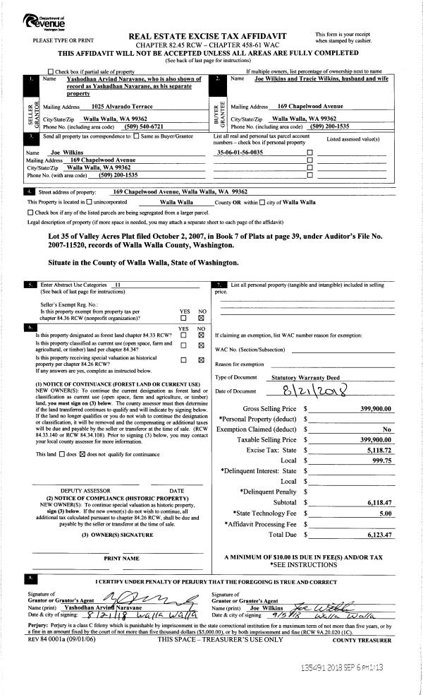 | 1 | 09/06/2018 | SWD | STATUTORY WARRANTY DEED | NAVAVANE YASHODHAN ARVIND | WILKINS JOE & TRACIE | | | $399,900.00 | 135491 | 2018-07406 |