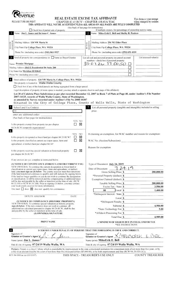 | Mailing Address: | SHELBY R PAULSEN 134 NW MARIA ST COLLEGE PLACE, WA 99324 | % Ownership: | 100.0000000000% |