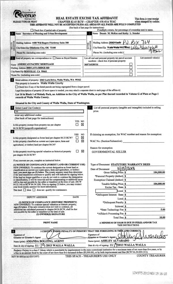 | 2 | 11/19/2013 | WARRANTY D | WARRANTY DEED | THE SECRETARY OF HOUSING & URBAN DEVELOPMENT | MC KEE DENNIS M ET AL | | | $104,000.00 | 124975 | 2013-11363 |