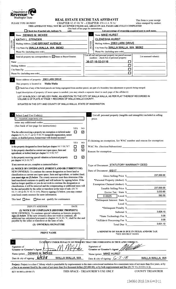 | 1 | 06/06/2018 | SWD | STATUTORY WARRANTY DEED | MC KEE DENNIS M ET AL | HURST MIKE & CLENESHA | | | $237,000.00 | 134860 | 2018-04526 |