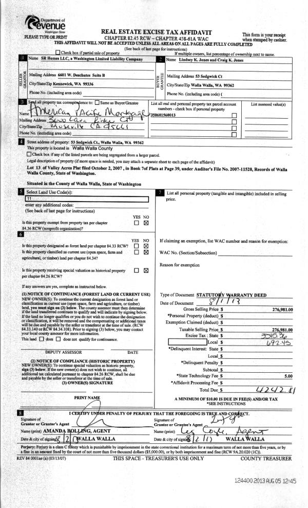 | 2 | 08/05/2013 | WARRANTY D | WARRANTY DEED | S R HOMES LLC | JONES, CRAIG K & LINDSEY K | | | $276,981.00 | 124400 | 2013-07936 |