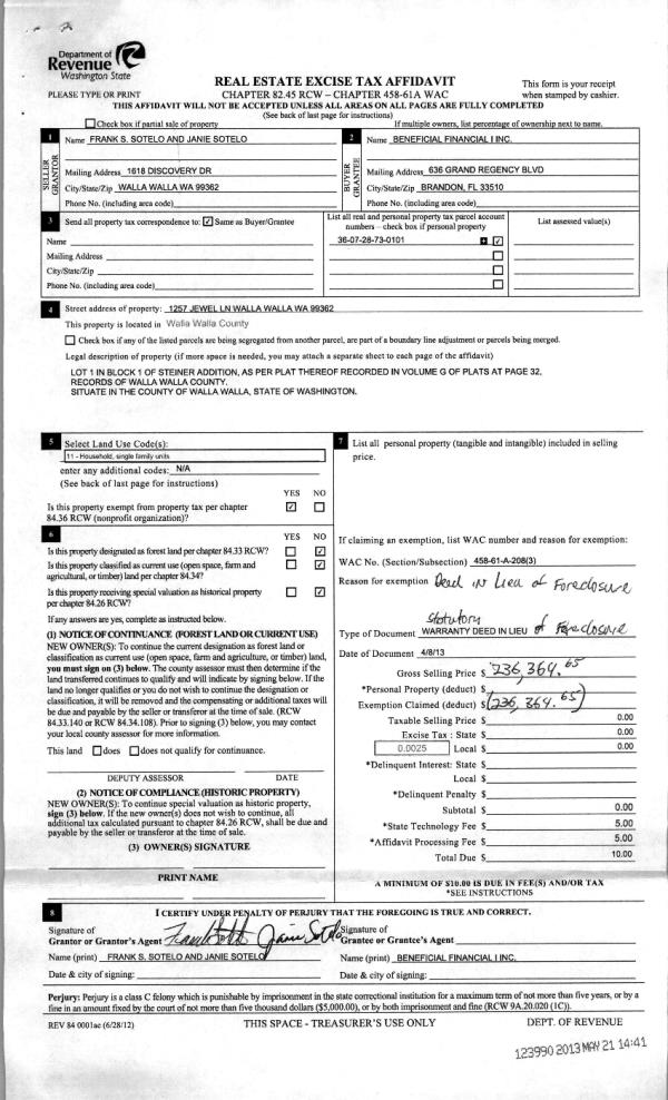| 2 | 05/21/2013 | WARRANTY D | WARRANTY DEED | SOTELO, FRANK S & JANIE | BENEFICIAL FINANCIAL INC | | | $236,364.00 | 123990 | 2013-05089 |