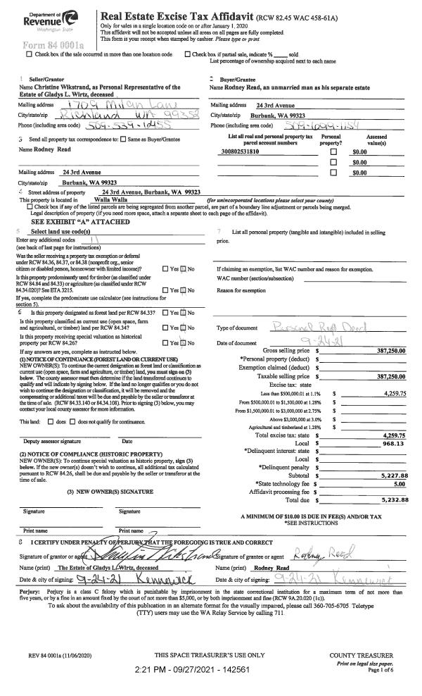 | 2 | 09/27/2021 | SWD | STATUTORY WARRANTY DEED | WIRTZ GLADYS LORRAINE ESTATE OF | READ RODNEY | | | $387,250.00 | 142561 | 2021-11808 |