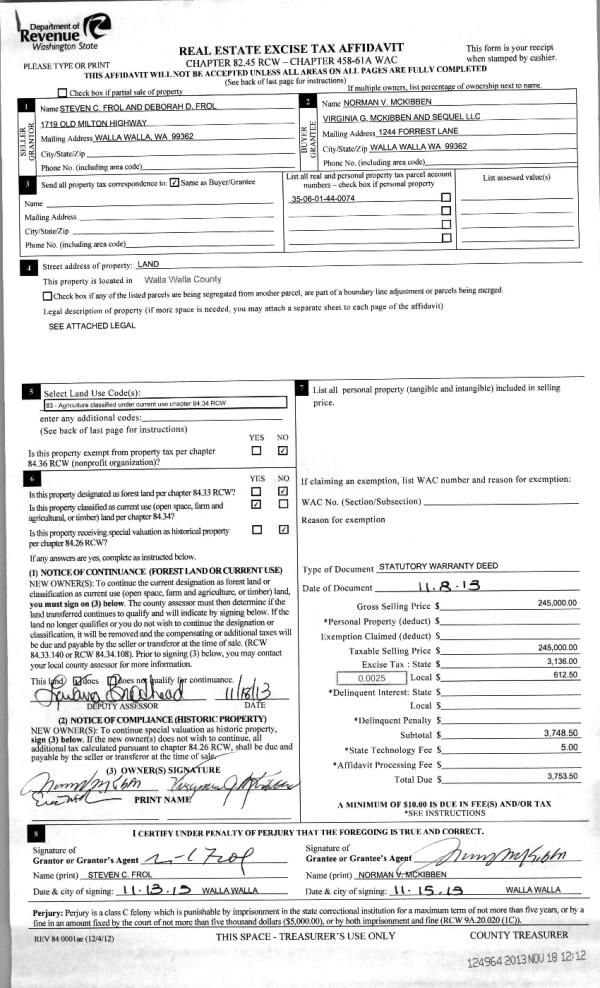 | 2 | 11/18/2013 | WARRANTY D | WARRANTY DEED | FROL STEVEN C & DEBORAH D | MC KIBBEN NORMAN V & VIRGINIA G AND SEQUEL LLC | | | $245,000.00 | 124964 | 2013-11302 |