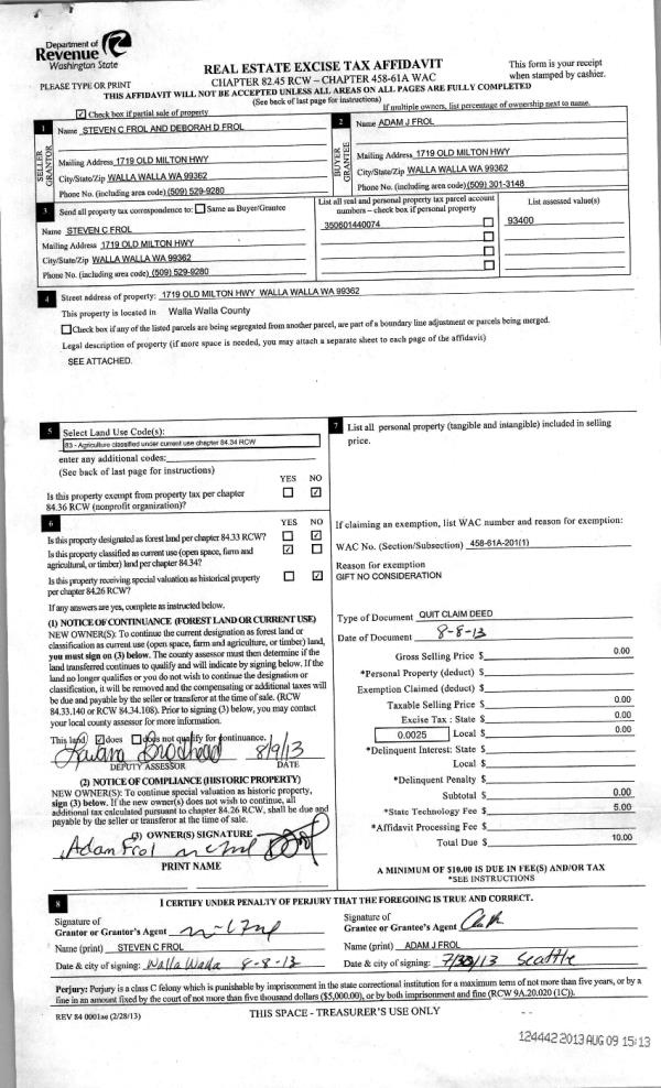 | 3 | 08/09/2013 | QCD | QUIT CLAIM DEED | FROL, STEVEN C & DEBORAH D | FROL, STEVEN C & DEBORAH D | | | $0.00 | 124442 | 2013-08139 |
