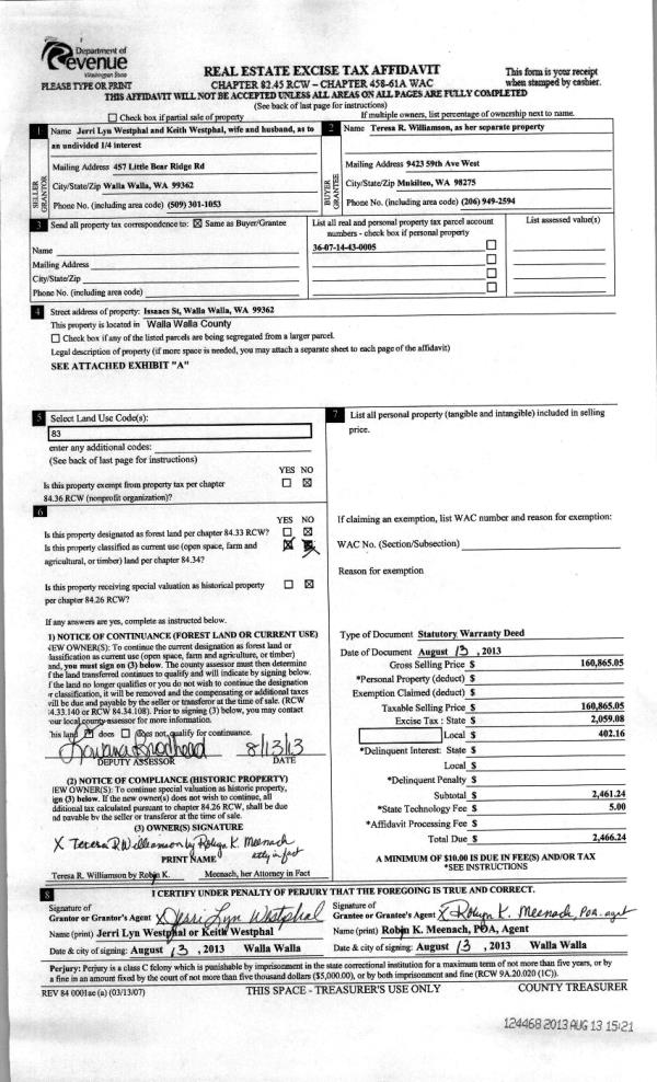 | 4 | 08/13/2013 | WARRANTY D | WARRANTY DEED | WESTPHAL, KEITH & JERRI LYN | WILLIAMSON, TERESA R | | | $160,865.00 | 124468 | 2013-08257 |