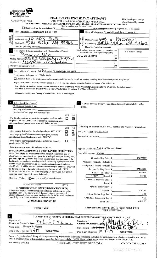 | 1 | 10/09/2019 | SWD | STATUTORY WARRANTY DEED | MORRIS MICHAEL PATRICK | WRIGHT MONTGOMERY C & AMY J | | | $275,000.00 | 137843 | 2019-08047 |