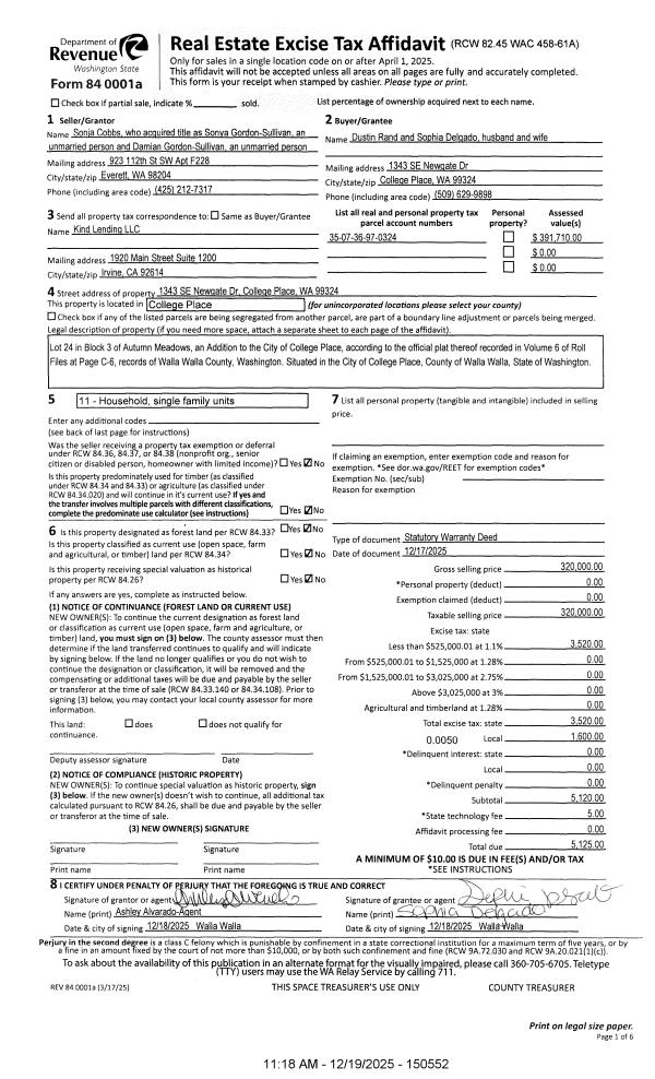 | 1 | 12/19/2025 | SWD | STATUTORY WARRANTY DEED | GORDON-SULLIVAN DAMIAN & SONYA | RAND DUSTIN & SOPHIA DELGADO | | | $320,000.00 | 150552 | 2025-07816 |