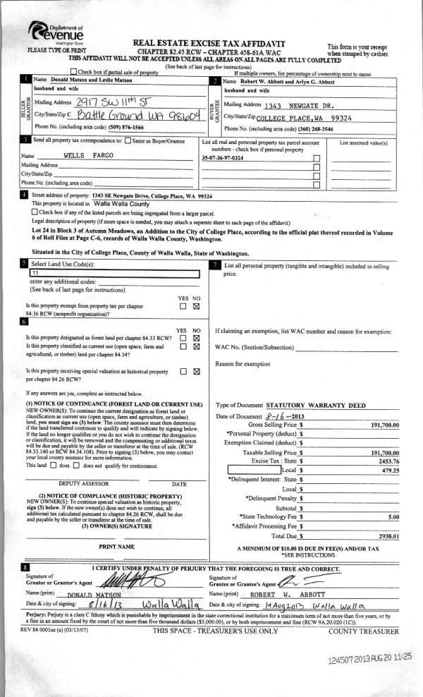 | 3 | 08/20/2013 | WARRANTY D | WARRANTY DEED | TAYLOR, LESLIE A | ABBOTT, ROBERT W & ARLYN G | | | $191,700.00 | 124507 | 2013-08538 |