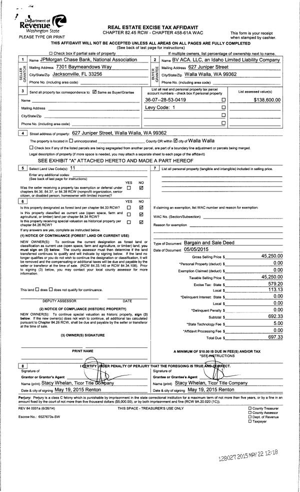 | 3 | 05/22/2015 | BARGAIN & | BARGAIN & SALE DEED | JPMORGAN CHASE BANK NATIONAL | BV ACA LLC | | | $45,250.00 | 128027 | 2015-04350 |