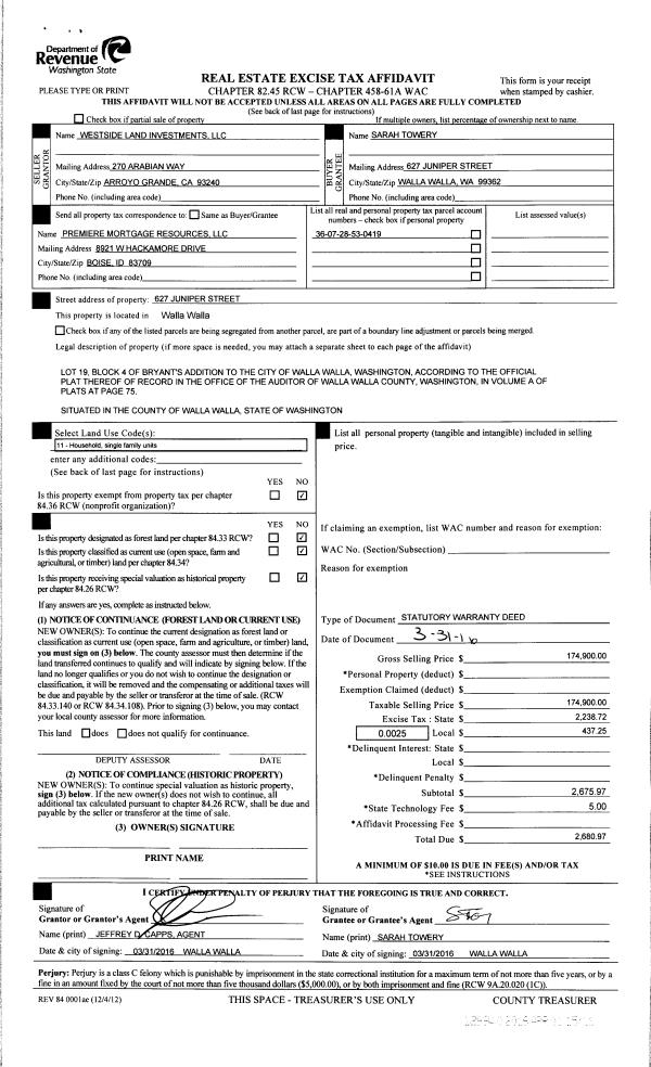 | 1 | 04/01/2016 | SWD | STATUTORY WARRANTY DEED | WESTSIDE LAND INVESTMENTS LLC | TOWERY SARAH | | | $174,900.00 | 129940 | 2016-02403 |