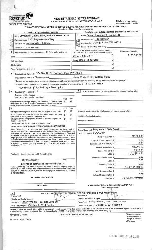 | 2 | 11/03/2014 | BARGAIN & | BARGAIN & SALE DEED | JPMORGAN CHASE BANK NATIONAL | DEKIAN INVESTMENT GROUP LLC | | | $95,000.00 | 126788 | 2014-07528 |