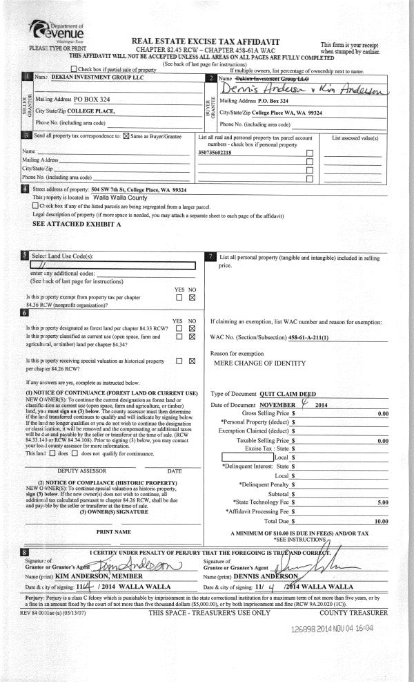 | 1 | 11/04/2014 | QCD | QUIT CLAIM DEED | DEKIAN INVESTMENT GROUP LLC | ANDERSON DENNIS & KIM | | | $0.00 | 126898 | 2014-08094 |