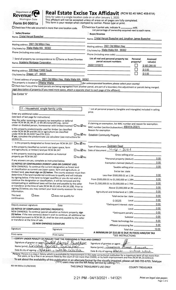 | 1 | 04/06/2021 | QCD | QUIT CLAIM DEED | HENZEL CRISTAL | BUESCHER CRISTAL HENZEL & JONATHON JAMES | | | $0.00 | 141321 | 2021-04346 |