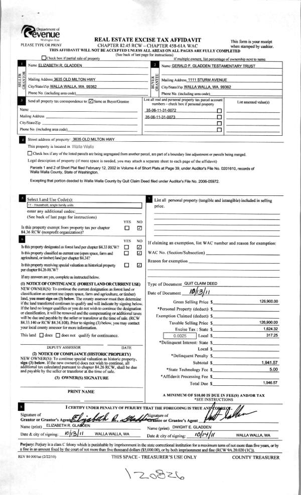 | 7 | 05/24/2006 | QCD | QUIT CLAIM DEED | GLADDEN, GERALD F & ELIZABETH | WALLA WALLA COUNTY | | | | 110327 | 2006-05972 |