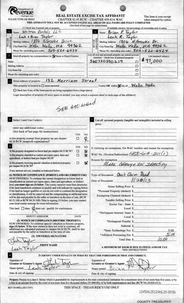 | 2 | 08/20/2013 | QCD | QUIT CLAIM DEED | WHITMAN RENTALS LLC | TAYLOR, BRIAN P & LEAH | | | $0.00 | 124506 | 2013-08526 |