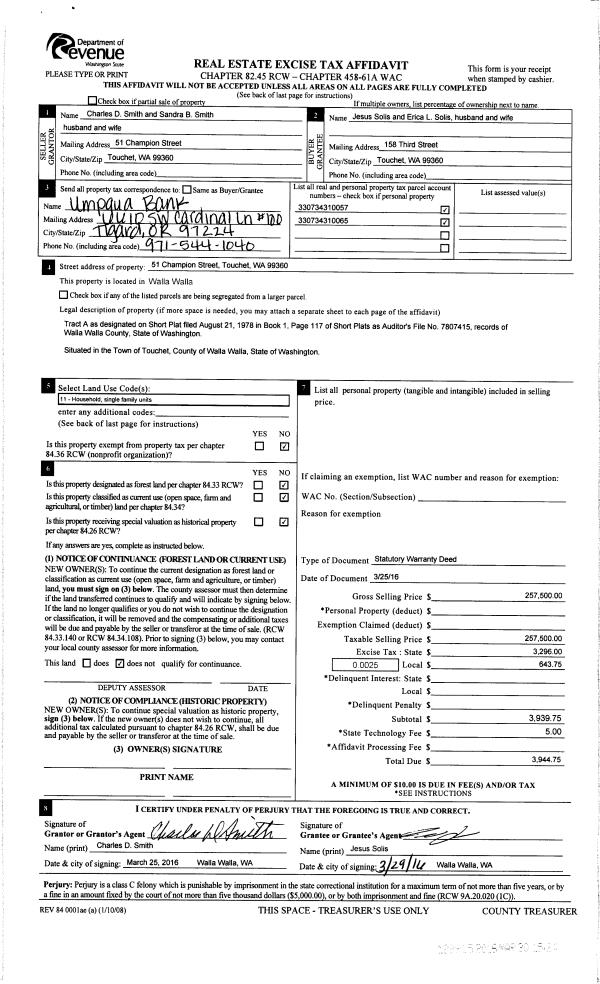 | 1 | 03/30/2016 | SWD | STATUTORY WARRANTY DEED | SMITH CHARLES D & SANDRA B | SOLIS JESUS & ERICA L | | | $257,500.00 | 129915 | 2016-02325 |